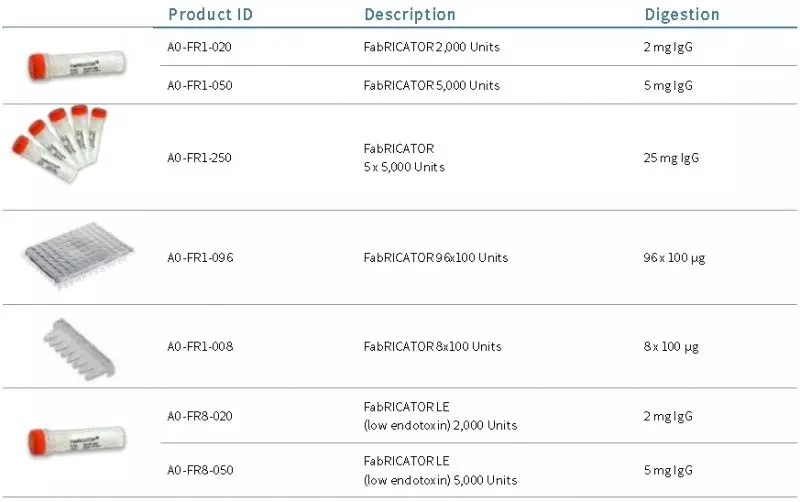 FabRICATOR® (IdeS) 是一种独特的半胱氨酸蛋白酶,在铰链区下方的一个单一氨基酸位点酶切IgG,可对多种来源的IgG进行酶切(人源,鼠源,兔,猴,绵羊、嵌合IgG、Fc融合蛋白等),特点是:高特异性单一酶切位点,30分钟快速酶切,操作简单快捷。