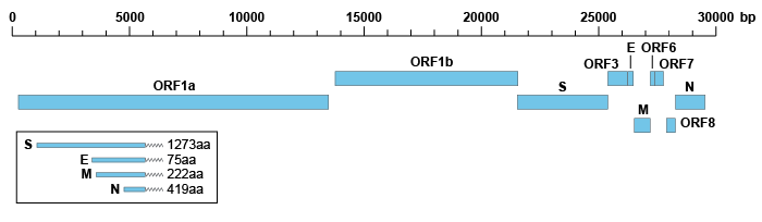 SARS-CoV-2 是一种约 30kb 的阳性单链 RNA 病毒,其基因组组成与 SARS-CoV 相似,两者都是由两个主要的开放阅读框(ORF)和几个较小的下游 ORF 组成。