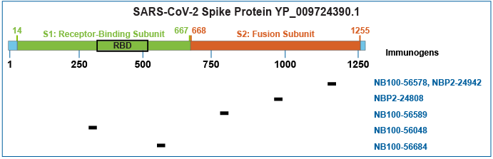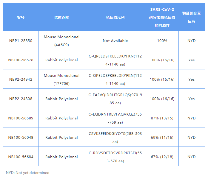 SARS-CoV-2 的表面糖蛋白或刺突蛋白与 SARS-CoV 的刺突蛋白具有 76% 的序列同源性。Novus Biologicals® 提供了几种用于检测 SARS-CoV 刺突蛋白的抗体,这些抗体可用于 WB、ICC / IF、ELISA 等多种应用。根据Novus 的创新计划,不妨试验其中的抗体用于检测 SARS-CoV-2。