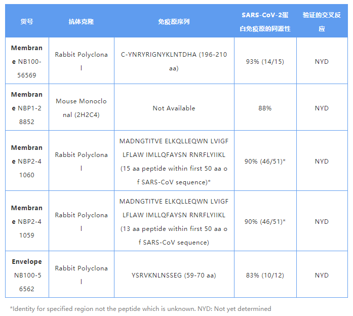 SARS-CoV-2 与 SARS-CoV 的膜蛋白具有 91% 的序列同源性,包膜蛋白具有 95% 的序列同源性。Novus Biologicals® 提供了几种用于检测 SARS-CoV 内膜蛋白和包膜蛋白的抗体,这些抗体可用于 WB、ICC / IF、ELISA 等多种应用。