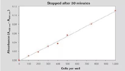 图1. Cytotoxicity Detection KitPLUS (LDH)具有良好的线性;图为使用该试剂盒测定不同数目U-937细胞培养基中总LDH活性,底物孵育5min后进行检测。