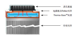 Cross-sectional view of the LightCycler 480II thermal cycle module. Therma-BaseTM is a cavity with an inner wall covered with a wicked capillary structure to effectively increase the contact surface area. Through a series of real-time condensation and evaporation effects, heat is efficiently transferred to achieve excellent temperature uniformity across the board.