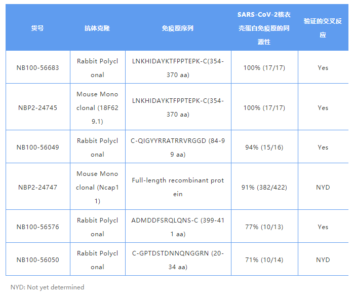 SARS-CoV-2 与 SARS-CoV 的核衣壳蛋白具有 91% 的序列同源性。Novus Biologicals® 提供了几种用于检测 SARS-CoV 核衣壳蛋白的抗体,这些抗体可用于 WB、ICC / IF、ELISA 等多种应用。