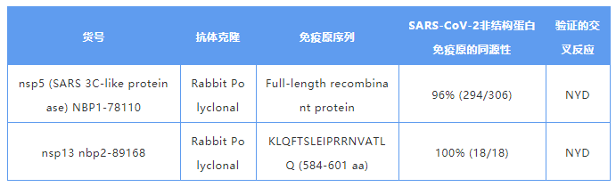 SARS-CoV-2 与 SARS-CoV 的 nsp5 具有 96% 序列同源性,nsp13 具有 99% 的序列同一性。Novus Biologicals® 提供了针对 nsp5(NBP1-78110)和 nsp13(nbp2-89168)蛋白的兔多克隆抗体,这些抗体可用于 WB、ICC / IF、ELISA 等多种应用。