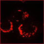 感染 6 小时后的 Vero-E6 细胞中,使用抗 SARS-CoV nsp13 兔多克隆抗体(NBP2-89168)进行免疫荧光显微镜检查。