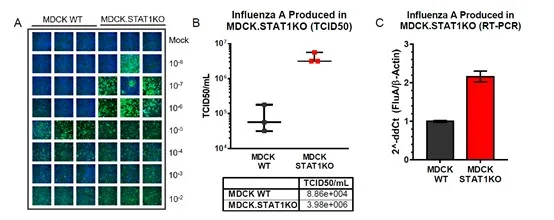 图1. 甲型流感(H1N1;ATCC®VR-1736™) 接种 STAT1-KO-MDCK 细胞实验结果。(A)MDCK WT 亲本和 MDCK.STAT1 型 KO 细胞,接种甲型流感,48小时后收集细胞上清液。绿色-抗流感病毒染色,蓝色-核染色。(B)感染甲型流感病毒48小时后细胞上清液的TCID50值。(C) RT-PCR法定量检测感染48小时后甲型流感病毒基因组拷贝数。