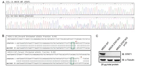 图2. STAT1-KO-MDCK 细胞特征。(A)MDCK.STAT1KO 细胞 STAT1 基因测序结果证实STAT1基因断裂。(B)测序结果显示,MDCK.STAT1KO 细胞是一个杂合子。一条等位基因存在单一碱基插入,另一个等位基因存在4碱基的缺失。(C)WB结果显示,无论是低代次还是高代次, MDCK.STAT1KO 细胞都没有 STAT1  蛋白表达。