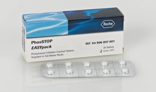 PhosSTOP磷酸酶抑制剂混合物也是Roche为蛋白研究做出的著名贡献之一。优化配方的磷酸酶抑制剂混合物在蛋白抽提时抑制内源和外源磷酸酶对蛋白磷酸化状态的改变,是信号通路研究中的必要操作。这样的处理保证了蛋白的磷酸化状态,提高了实验数据的稳定性、重现性和可比性。适用于各种样品,包括哺乳动物、植物、酵母和细菌等。