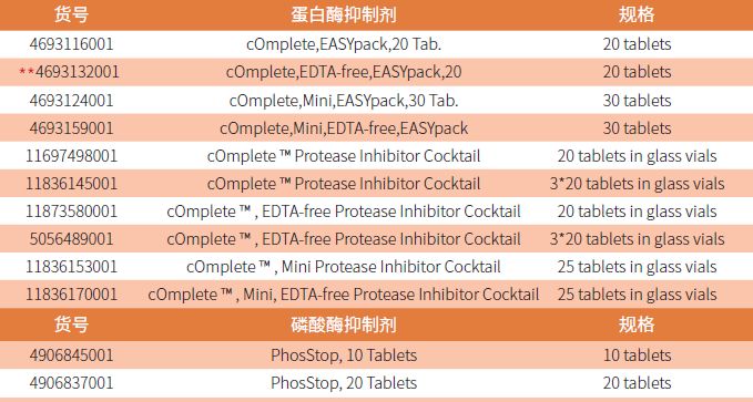 蛋白酶抑制剂分为含有EDTA或不含两大类,后者用于金属螯合亲和层析。除了提供方便的片剂形式,铝箔包装进一步提高了研究者操作的方便性。