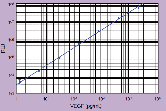 结果:显示由 SpectraMax® L 微孔板化学发光酶标仪按照上述的参数所得的 VEGF 标准曲线, 其动态范围超过 4 个数量级,计算所得的检测限,也就是空白对照信号标准差 3 倍值的相应量为 1.5 pg/mL,与该试剂盒平均检测下限为 3.3 pg/mL 相符。