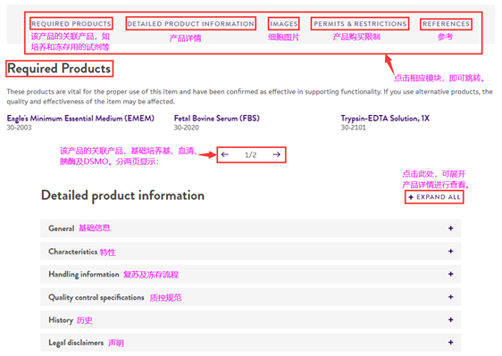 在产品详情页面上,您还可以了解到该产品的关联产品,如:培养和冻存用的基础试剂等;产品的详细描述;细胞形态图片(如有);产品购买限制;参与文献等等信息,便于您进一步了解产品的情况。