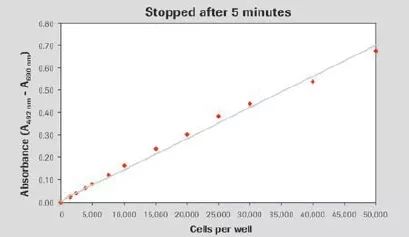 图1. Cytotoxicity Detection KitPLUS (LDH)具有良好的线性;图为使用该试剂盒测定不同数目U-937细胞培养基中总LDH活性,底物孵育5min后进行检测。